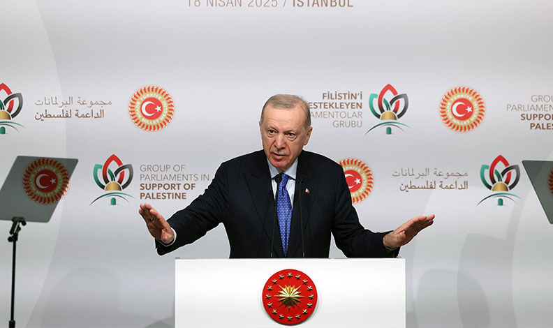 Mazlumların yanında yer almayan bir küresel düzenin, zalimlerin oyuncağı olmaya mahkum olduğunu söyleyen Erdoğan, “Bugün dünya zalim karşısında susan, hatta zulmü alkışlayan bir düzenin esiri olmuştur. Uluslararası hukuk, adaleti tesis etmenin değil, güçlünün gücünü tahkim etmesinin aparatı haline gelmiştir. Hukukun üstünlüğü yerine kişiye ve devlete göre hukuk düzeni hakimdir. Gazze’de uluslararası sistem sınavı kaybetmiştir. Birleşmiş Milletler’den Avrupa Birliği’ne birçok kurum kuruluş, savundukları ilkeleri çiğneme pahasına Gazze’de kötü bir imtihan vermiştir. Elbette başkalarını eleştirirken kendimizi ihmal edemeyiz. Bakın. Üzülerek söylüyorum. İçim kan ağlayarak söylüyorum. İslam dünyası da kendisinden bekleneni maalesef yerine getirememiştir. Şüphesiz çok gayret sarf edildi. Zulmü engellemek için pek çok yol denendi. Diplomasinin bütün imkanları kullanıldı. Toplantılar, zirveler, temaslar gerçekleştirildi. Ama sonuçta Gazze’nin tamamen yıkılmasına, 60 bine yakın Gazzelinin katledilmesine mani olunamadı. Bunun üzerinde hepimizin uzun uzun düşünmesi gerekiyor. Müslümanlar olarak kapsamlı bir muhasebeye ihtiyacımız olduğu açıktır. Tabii burada şu gerçeği de vurgulamak durumundayım. Filistinliler öldürülürken sesleri çıkmayanların, Gazze halkının işgale karşı verdiği direnişe terörizm yaftası vurarak soykırımı normalleştirmeye çalıştıklarını görüyoruz. Türkiye olarak bu iftiraları, bu kara propagandayı reddettiğimizi bugün bir kere çok net biçimde söylemek isterim” diye konuştu.