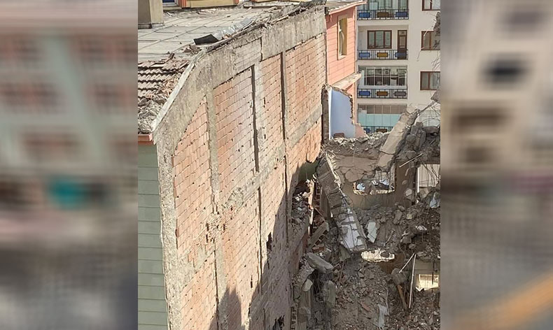 Elazığ’da ağır hasarlı binanın yıkımı sırasında yanda bulunan sağlam caminin duvarı zarar gördü.