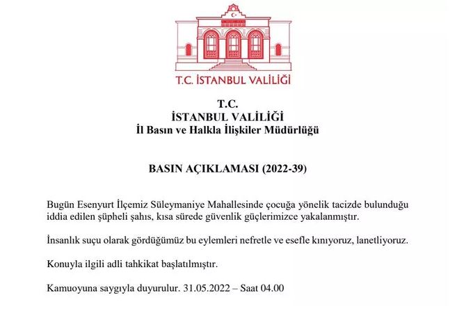 İstanbul Valiliğinden yapılan açıklamada, “Bugün Esenyurt ilçemiz Süleymaniye Mahallesi’nde çocuğa yönelik tacizde bulunduğu iddia edilen şüpheli şahıs, kısa sürede güvenlik güçlerimizce yakalanmıştır. İnsanlık suçu olarak gördüğümüz bu eylemleri nefretle ve esefle kınıyoruz, lanetliyoruz.” ifadelerine yer verildi.