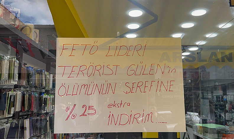 Esnaf Semih Arslan, FETÖ terör örgütü lideri Fethullah Gülen’in ölümü nedeniyle iş yerinde yüzde 25 indirim kampanyası başlattı. İş yerinin camına bir pankart ile bu indirimi duyuran Semih Arslan, “Fethullah Gülen’in ölmesi şerefine indirim yapıyoruz. Halktan yoğun ilgi var, herkesi bekleriz” dedi. İndirim müşterilerin de ilgisini çekti.
