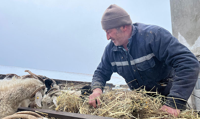 Sofça Mahallesi’nde 100 adet keçi ve koyunu olan küçükbaş besicisi Ahmet Yiğit, hayvanlarını yazın dağlarda yaydığın fakat yağan karla birlikte beslemeye çalıştığını belirtti. Yiğit konuyla alakalı, “Yaklaşık 100 keçi ve koyun var. Koyun ve keçileri bölüm bölüm yemlemeye çalışıyorum. Ayazda ve karda bayağı bir emek sarf etmek gerekiyor. Az önce de gördüğünüz gibi yemleri getirip götürmek zorlayıcı oluyor. Hayvanları kış sebebiyle devamlı içerde bakmak haliyle bizi daha çok zorluyor. Ellerim cebimde şuan, ellerimi cebime sokuyorum ayrıca eldiven giyiyorum ama fayda etmiyor, illaki ellerim üşüyor. Yeri geliyor hayvanları doyurmak, yemlemek için sabah saat 6-7 gibi kalkıyoruz. Onlar önemli. Hayvanları karda yürütmüyoruz, hava rüzgârlı olmadığında keçileri dışarı salıyorum. Ben bu hayvanlara 3 öğün yemek veriyorum, günde yaklaşık 7 balya yem veriyorum. Evlatlarım gibi bakıyorum, hem gelirimiz için hem de sevdiğimiz için bu hayvancılığı yapıyoruz. Onlar doyduğu zaman baktıkça ferah duyuyorum” dedi.