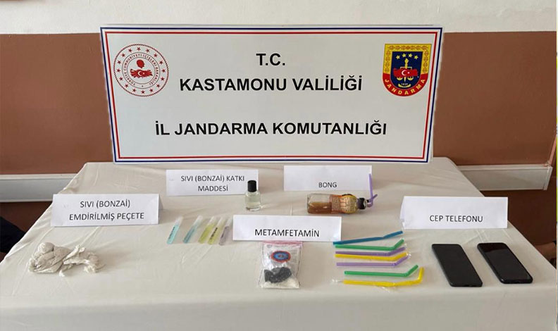 Edinilen bilgiye göre, Kastamonu İl Jandarma Komutanlığı ekipleri tarafından uyuşturucuyla mücadele kapsamında yürütülen çalışmalar neticesinde, 20 gram metamfetamin, 5 adet şişe halinde 90 mililitre sıvı sentetik kannabinoid katkı maddesi, 500 kullanımlık kannabinoid sıvı madde emdirilmiş 4 adet nemli kıvamda peçete parçası, 190 adet makarona doldurulmuş halde 95 gram kannabinoid katkılı tütün maddesi, 3 adet fişek halinde 5 gram kannabinoid katkılı tütün maddesi, 1 paket tütün sarma kağıdı, 5 adet cep telefonu ve 6 adet SIM kartı, 1 adet bong olarak tabir edilen uyuşturucu madde içme aparatı ele geçirildi.