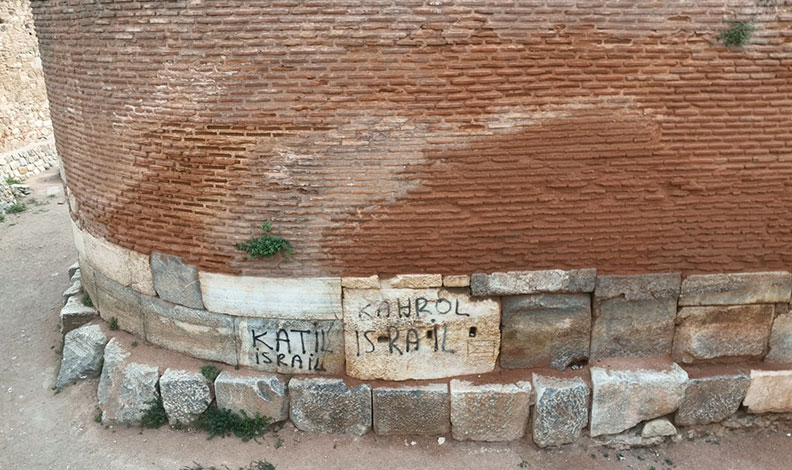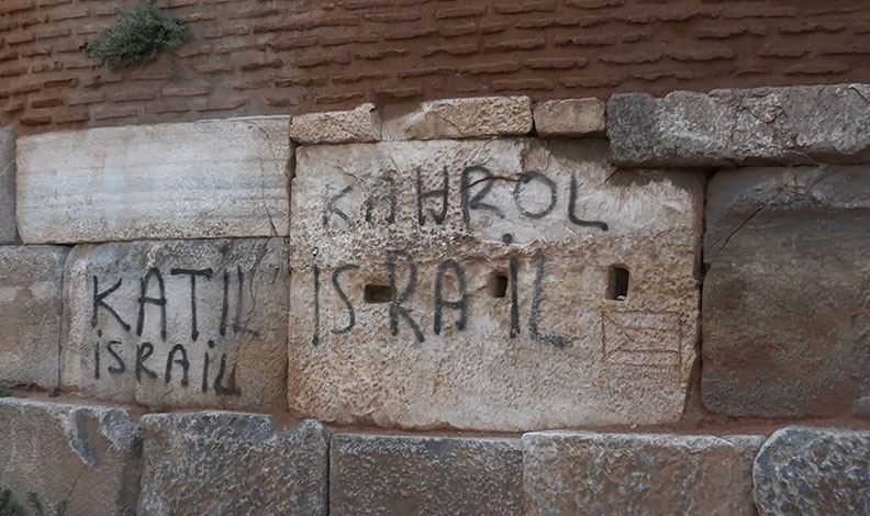 İsrail’in yaptığı soykırımı protesto etmek isteyen kişi veya kişilerin 2400 yıllık tarihi surlara yazdığı ‘Katil İsrail’ ve ‘Kahrol İsrail’ sloganları kimseyi hoşnut etmedi.