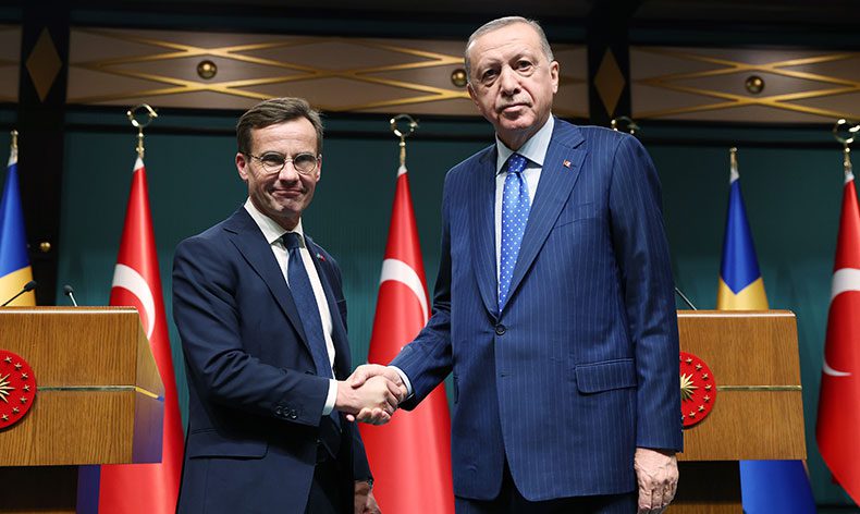 İsveç’in NATO’ya üyelik başvurusunun görüşmelerde önemli yer tuttuğunu ifade eden Cumhurbaşkanı Erdoğan, “Türkiye, NATO’nun açık kapı politikasının her zaman güçlü destekçisi olmuştur. İsveç ve Finlandiya’nın katılım müzakerelerinin başlatılmasına da esasen bu yaklaşımımız doğrultusunda Madrid’de onay verdik. İsveç’i askeri ittifaklara katılmama politikasına son vermeye iten güvenlik kaygılarını anlayışla karşılıyoruz” dedi.