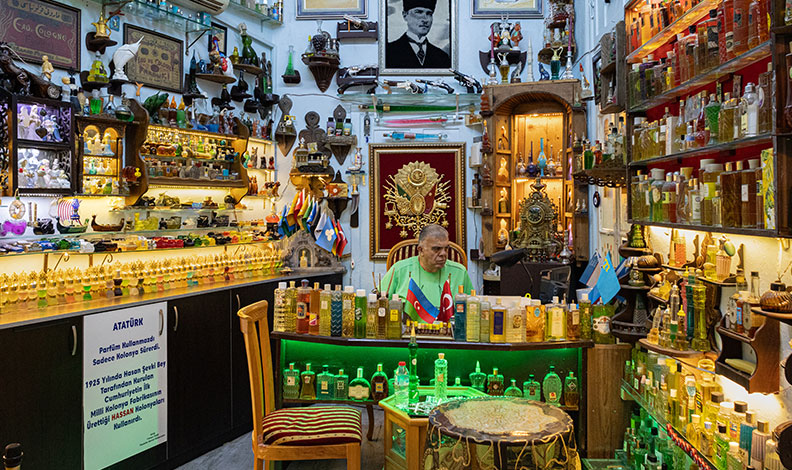 100 yıllık Bahçeliler Hanı’nda mis gibi kokan kolonyaları sergileyen Ünal Çınar’ın koleksiyonunda, 1886 yılından kalan kolonyalar ve şişeleri bile var. Türkiye’nin ilk kolonyalarının da bulunabileceği paha biçilmez koleksiyon, adeta görenleri hayran bırakarak tarihi bir yolculuğa çıkarıyor. Koleksiyonda; tabanca, araba, horoz, çizgi film karakterleri, hayvanlardan oluşan ilginç kolonyalarda yer alıyor.