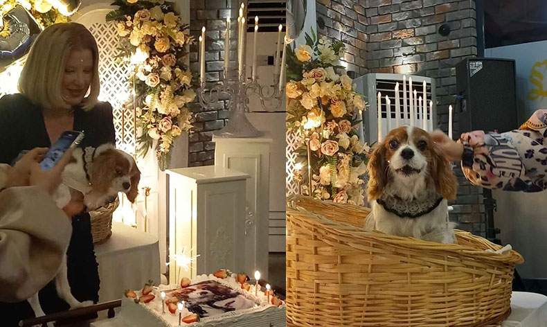Düzce’de Sibel Kabasakal, king charles cinsi Gofret isimli köpeğinin 6. yaş gününü partiyle kutladı. Gofret, sepete konularak partinin yapılacağı yere getirildi. Aynı zamanda pasta da kesildi.