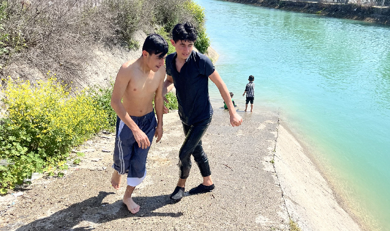 Sulama kanalına giren Muhammed El Süleyman (12), “Çok sıcak o nedenle kanala giriyorum. Yüzmekten korkmuyorum, yüzme biliyorum” dedi.