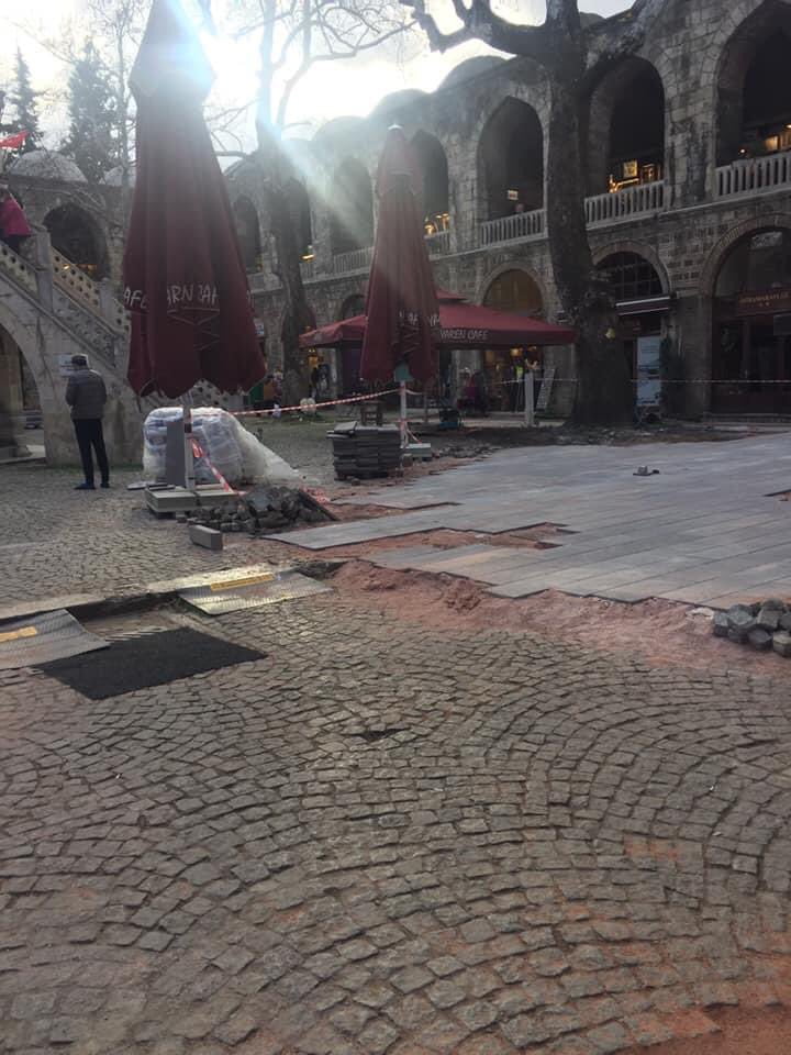 Beş asırdan fazla Bursa’da ayakta kalan Koza Han’da Bursa Büyükşehir Belediyesi’nin yapmış olduğu zemin yenileme çalışmalarını üzülerek izliyoruz.