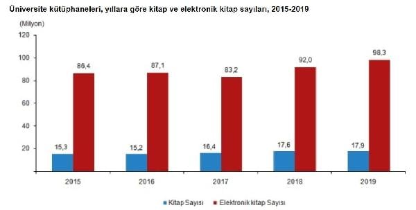 Türkiye’de 126’sı devlet 72’si vakıf üniversitesi olmak üzere toplam 198 üniversitede kütüphane bulunuyor. Kütüphane sayısı, yüzde 2.0 artarak 610’a çıktı. Üniversite kütüphanelerindeki kitap sayısı yüzde 2.0 artarak 17 milyon 945 bin 383’e çıktı. 2019 yılında e-kitap sayısı yüzde 6.8 artarak 98 milyon 292 bine yükseldi.