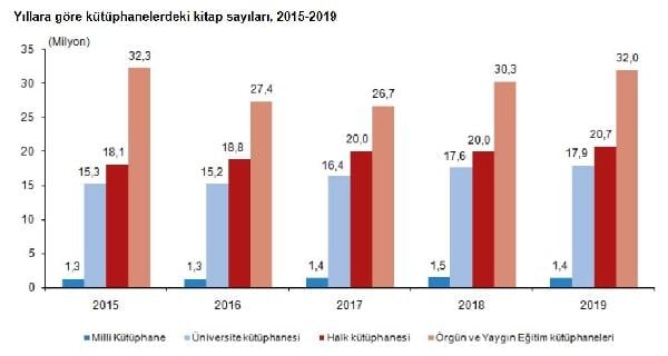 Resmi okul, özel okul ve özel kurs kütüphanelerini kapsayan örgün ve yaygın eğitim kütüphanelerinin sayısı, 2019 yılında 2018 yılına göre yüzde 3.1 artarak 30 bin 618 oldu. Örgün ve yaygın eğitim kütüphanelerindeki kitap sayısı, yüzde 5.8 artarak 32 milyona çıktı.