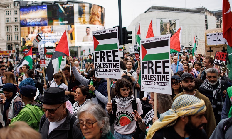 İngiltere’nin başkenti Londra’da düzenlenen ve binlerce kişinin katıldığı Filistin’e destek yürüyüşünde “Nehirden denize Filistin özgür olacak” sloganları atıldı.