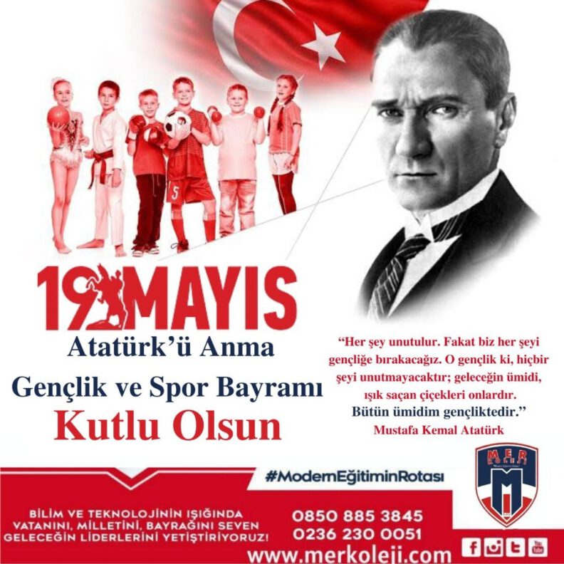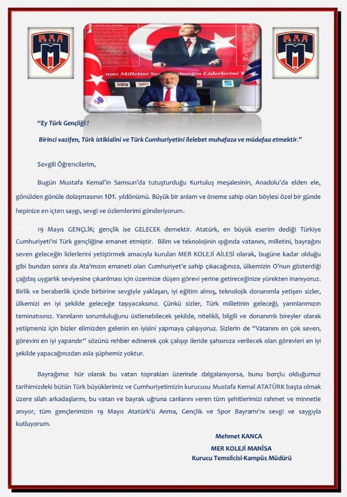 19 Mayıs’ın, Türk Milleti’nin bağımsızlık ve özgürlük umutlarının inanca dönüştüğü, kurtuluş ateşinin yakıldığı ve aydınlık bir geleceğe olan inancın kuvvetlendiği günün adı olduğunu kaydeden MER Koleji Kampüs Müdürü Mehmet Kanca, “19 Mayıs Atatürk’ü Anma Gençlik ve Spor Bayramı’mız kutlu olsun. Uzaktan Eğitim Sistemi’nde online platforma taşınan eğitim süreçlerinde her türlü engeli aşarak eğitim öğretim kalitesinden ödün vermeden yoluna devam eden MER Koleji, online eğitim sürecinde ortaya koyduğu çalışmalara bir yenisini daha ekledi ve bu defa da 19 Mayıs Atatürk’ü Anma, Gençlik ve Spor Bayramı’nı tüm coşkusuyla yaşıyor ve yaşatıyor olmanın haklı gururunu hissediyor.” dedi.
