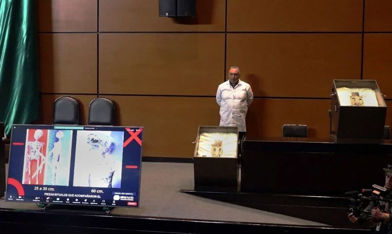 Jaime Maussan, 12 Eylül Salı günü Meksika Temsilciler Meclisi’nde yaptığı sunumda iki adet mumya sergilemiş ve bunların yapılan DNA testleri sonucunda insan olmadıklarının kanıtlandığını iddia etmişti. Jaime Maussan ayrıca sunumunda Dünya’nın evrenin derinliklerinden gelen insan dışı zeki varlıklar tarafından ziyaret edildiği gerçeği kabul edilirse başka evrenlere seyahat etmenin mümkün olacağını ifade etmiş ve Meksikalı milletvekillerinden dünya dışı yaşamın varlığını tanımalarını talep etmişti.