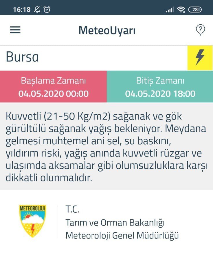 Meteoroloji Genel Müdürlüğü’nden yapılan açıklama, “Kocaeli, Yalova ve Bursa’da beklenen sağanak ve gök gürültülü sağanak yağışların bu gece saatlerinden itibaren etkisini artırarak, yarın (04.05.2020 Pazartesi) akşam saatlerine kadar yerel olarak kuvvetli (21-50 Kg/m2) olacağı tahmin ediliyor. Meydana gelmesi muhtemel ani sel, su baskını, yıldırım riski, yağış anında kuvvetli rüzgar ve ulaşımda aksamalar gibi olumsuzluklara karşı dikkatli ve tedbirli olunmalıdır” denildi.