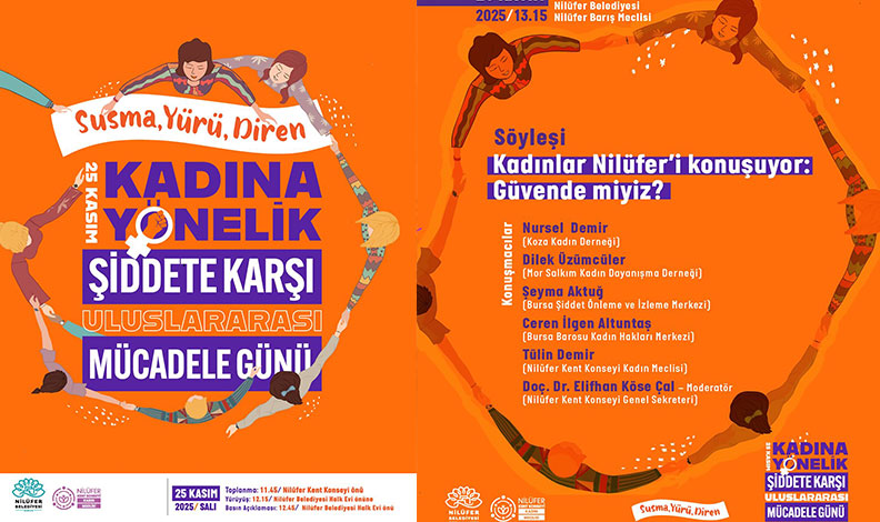 Nilüfer Belediyesi ve Nilüfer Kent Konseyi, 25 Kasım Kadına Yönelik Şiddete Karşı Uluslararası Mücadele Günü kapsamında, “Susma, Yürü, Diren” mottosuyla çeşitli etkinlikler düzenliyor. Kadına yönelik şiddetle mücadele ve toplumsal farkındalık oluşturmak amacıyla hazırlanan programda yürüyüş ve söyleşi yer alıyor.