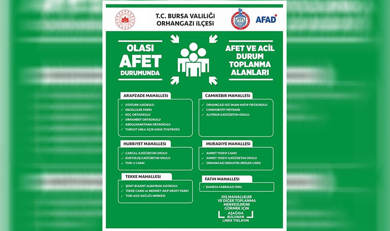 Belediye yetkilileri, vatandaşların yaşadıkları mahalledeki toplanma alanlarını önceden öğrenmeleri ve bu bölgeleri yakından tanımalarının olası bir afet durumunda hayat kurtarabileceğine dikkat çekti. Orhangazi Belediyesi’nin resmi internet sitesinden de bu alanların konum bilgilerine erişim sağlanabiliyor.