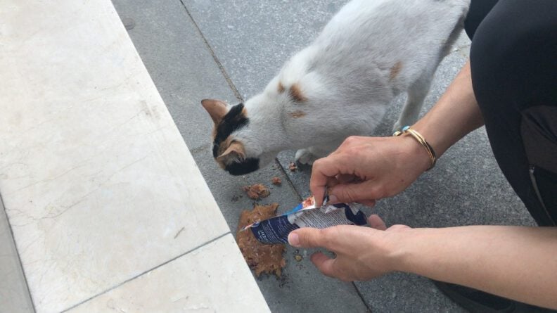 Öte yandan kısıtlama nedeniyle Fatih Kumkapı sahilinde görevini ifa eden polis ekipleri de, aç kalan kedileri mamayla besledi. Kendilerine verilen kumanyanın içerisindeki şişedeki suyu da bıçakla delen polis, sıcaktan bunalan kedileri rahatlattı.