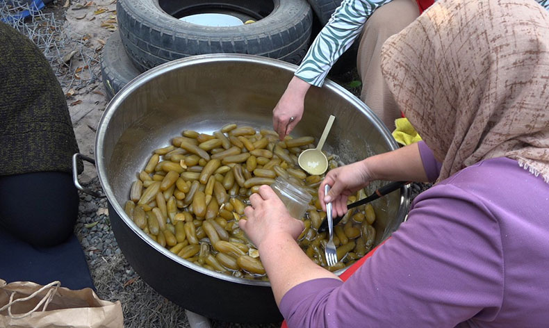 Iğdır’ın Kasımcan köyünde kadınların oluşturduğu Ayyıldız Kadın Girişimi Üretim ve İşletme Kooperatifi kadınları bu günlerde bütün zamanlarını patlıcan reçeli için ayırmış durumdalar. Sonbahar mevsimiyle büyümesi duran ve reçelin önemli püf noktalarından biri olan küçük boy patlıcanlar ile patlıcan reçeli serüveninin başladığını belirten Ayyıldız Kadın Girişimi Üretim ve İşletme Kooperatifi Başkanı Elif Turan, “Eylül ayında patlıcanları topluyoruz. Patlıcan reçeli küçük patlıcanlardan yapılıyor. Eylül ayında artık büyüme durduğu için patlıcanlar büyümüyor küçük ve sert patlıcanlardan reçel yapıyoruz. Reçel için patlıcanları akşamdan topluyoruz. Suda bekletiyoruz içine çok az tuz atıyoruz. Patlıcan acı suyunu ve siyah suyunu versin diye tuz atıyoruz. Sabah erkenden gelip o suyu boşaltıp yeniden su kaynatıyoruz. Patlıcanları suyun içine atıp haşlıyoruz. Daha sonra onu sıcak sudan çıkarıp soğuk suyun içine bırakıyoruz. O soğuk sudan daha sonra patlıcanları suyunu versin su kalmasın diye tek tek sıkıyoruz. Ondan sonra patlıcanları kaynattığımız şekerli suyun içine atıyoruz. Aynı zamanda limon da koyuyoruz. Aromasını ve lezzetini bulduğu zaman piştiği zaman şişelere sıcak sıcak doldurup bir gün beklettiriyoruz. Ondan sonra reçellerimizi alıyoruz” dedi.