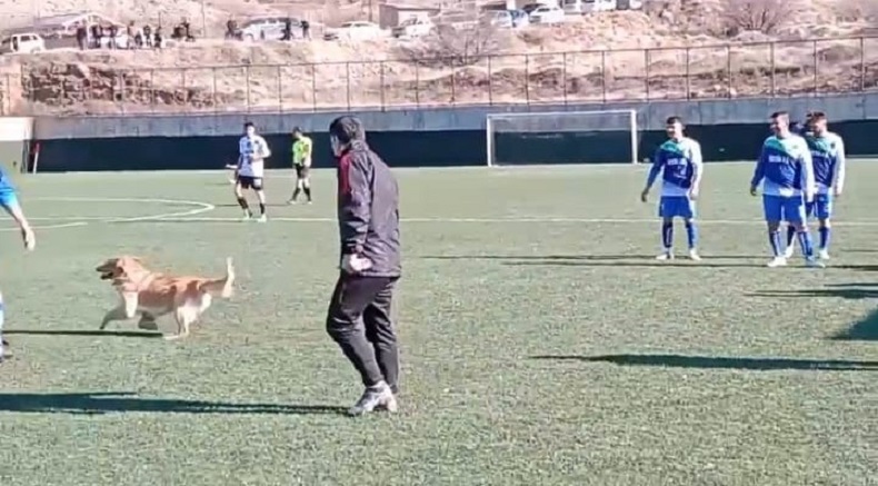 Malatya’da 1. Amatör Küme Ligi’nde Konakspor ile Darendespor arasında oynanan karşılaşmada sahaya giren köpek maçın durmasına neden oldu.