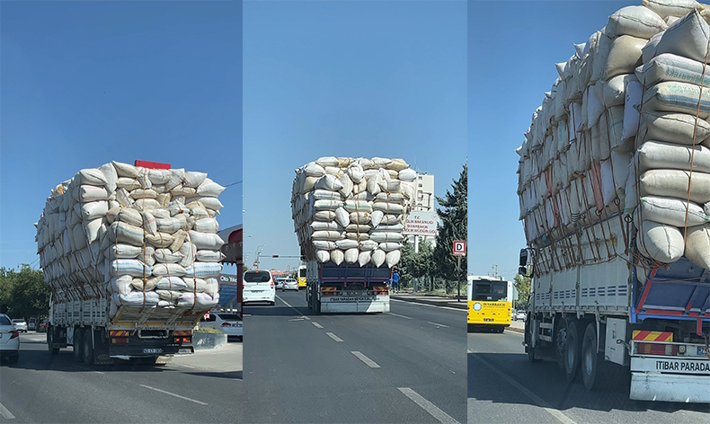 Diyarbakır’da aşırı yükü ve brandasız saman yüklü kamyon sürücüleri korkuttu.