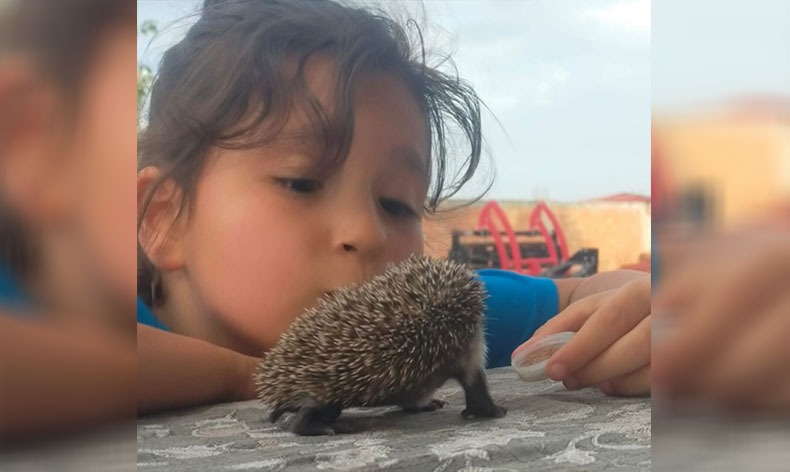 Dikenleri olan ve kendisini korumaya alıp kapatan kirpi yavrusu, minik kızın şefkati karşısında yumuşadı. Sıcaktan bunalan kirpi yavrusuna, su verildi, karnı doyuruldu ve doğaya salındı.