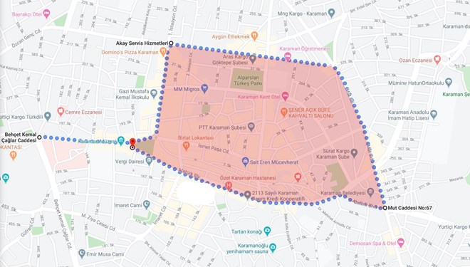“Turgut Özal Caddesinin Karaman Kalesi önünden başlayan kısmından doğuya doğru Atatürk Bulvarı’nın tamamında, Atatürk Bulvarının Zeytin Dalı Bulvarı ile kesiştiği kavşaktan (Karaman Belediyesi Önü) kuzey yönüne doğru, Zeytin Dalı Bulvarı ile Kazımkarabekir Caddesi’nin kesiştiği kavşaktan batıya doğru, Kazımkarabekir Caddesi’nin 1. İstasyon Caddesi ile kesiştiği kavşaktan güneye doğru, 1. İstasyon Caddesi’nin İsmet Paşa Caddesi ile kesiştiği kavşaktan tekrar Turgut Özal Caddesi ile birleştiği noktalar arasında kalan tüm cadde, sokak ve park gibi tüm açık alanlarda 5 Ağustos Çarşamba günü saat 23:00’ten itibaren ikinci bir karara kadar hareket halinde veya oturarak vatandaşlar tarafından dondurma ve kuruyemiş yenilmemesine, sigara içilmemesine oy birliğiyle karar verilmiştir.”