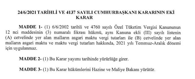 2021 yılı Haziran-Aralık döneminde alkollü içki ve sigaranın asgari maktu ve maktu vergi tutarları, yasalarda yer alan enflasyon kadar artış hükmünden muaf olacak.