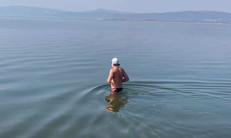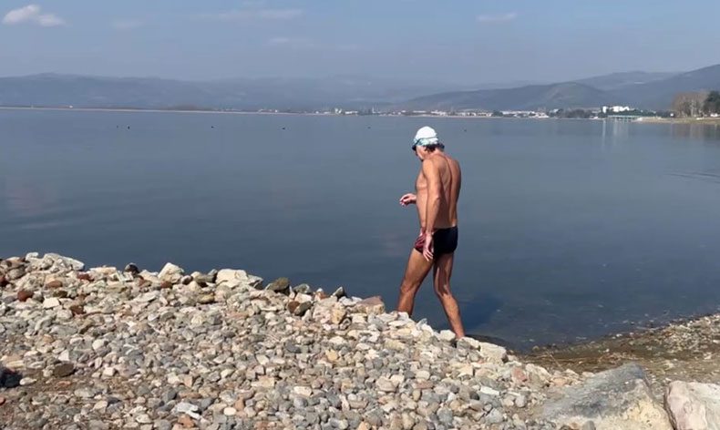 Bursa’da üç arkadaş kış soğuğuna aldırmadan Türkiye’nin 5., Marmara’nın en büyük gölü olan İznik Gölü’ne girerek yüzdü.