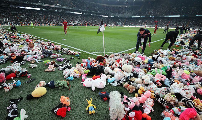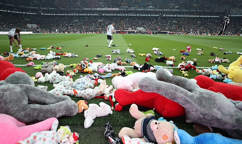Beşiktaş’ın Vodafone Park’ta Fraport TAV Antalyaspor ile oynadığı Spor Toto Süper Lig maçında tribünlerden binlerce oyuncak sahaya atıldı.