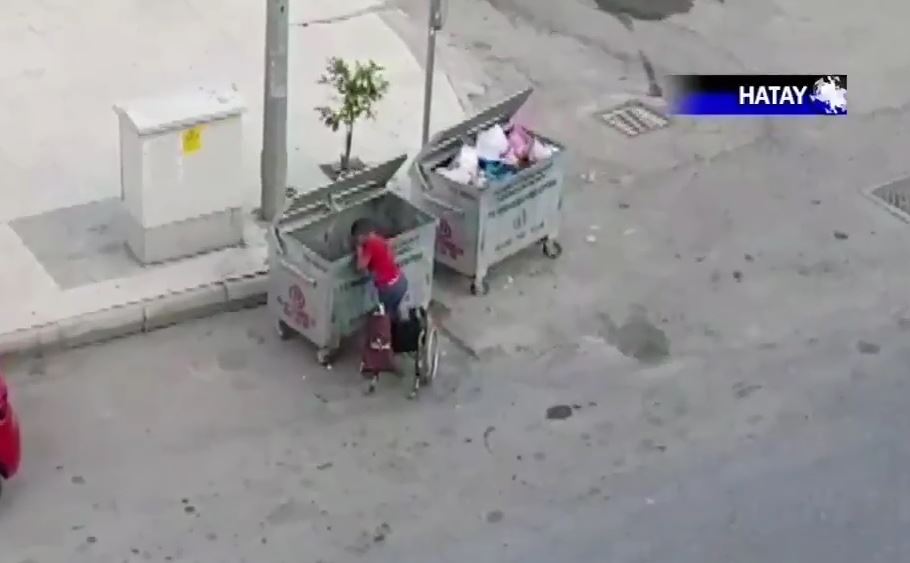 Hatay’ın İskenderun ilçesinde kaydedilen görüntülerde, engelli bir çocuk tekerlekli sandalyesi ile geldiği çöp konteynerinden plastik atık topladı. O çocuk çöp toplarken yoldan geçenler ise para verdi. İşte o kahreden görüntüler…