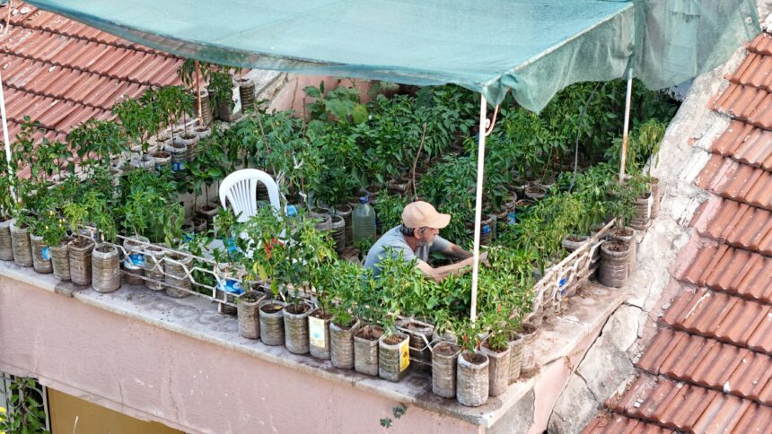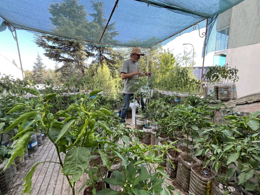 Eskişehir’de yaşayan Salim Pektaş, iş yerinin 18 metrekarelik terasına içi toprak dolu 200 bidona diktiği sebzelerle küçük bir bahçe dizayn ederken, gününün 8 saatini bu bahçede geçiriyor.