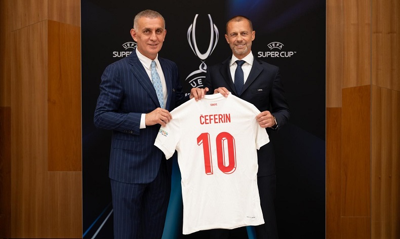 Görüşmenin sonunda TFF Başkanı Hacıosmanoğlu, UEFA Başkanı Ceferin’e hem üzerinde kendi isminin yazılı olduğu, hem de kaptan Hakan Çalhanoğlu’na ait ve tüm takım tarafından imzalanmış birer A Milli Takım forması takdim ederken, Ceferin de Başkan Hacıosmanoğlu’na 2024 UEFA Süper Kupa müsabakasında kullanılacak olan topu hediye etti.