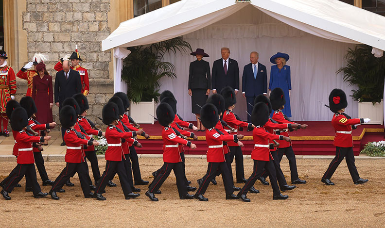 ABD Başkanı Donald Trump, göreve geldikten sonra gerçekleştirdiği 2. İngiltere temaslarına başladı. Trump, İngiltere Kralı 3. Charles ile görüşeceği Windsor Kalesi’ne helikopter ile geldi. First Lady Melania Trump ile birlikte Marine One helikopterinden inen Trump’ı, Galler Prensi William ve eşi Galler Prensesi Kate Middleton karşıladı. Prens ve prensesle ayaküstü sohbet eden ABD Başkanı Trump ve Firs Lady kısa bir yürüyüşün ardından İngiltere Kralı 3. Charles ve Kraliçe Camilla ile selamlaştı. Karşılama töreninin ardından Kraliyet üyeleri ve Trump çifti fayton konvoyuyla Windsor Kalesi’nin avlusuna geçti. Burada düzenlenen görkemli resmi törende Grenadier Muhafızları, Coldstream Muhafızları ve İskoç Muhafızları toplu bandosu tarafından ABD ve İngiliz milli marşları çalındı. İngiltere Kralı 3. Charles, Kraliçe Camilla, Galler Prensi William, Galler Prensesi Kate Middleton ve Trump çifti avludaki resmi tören tamamlandıktan sonra, öğle yemeğine geçti.