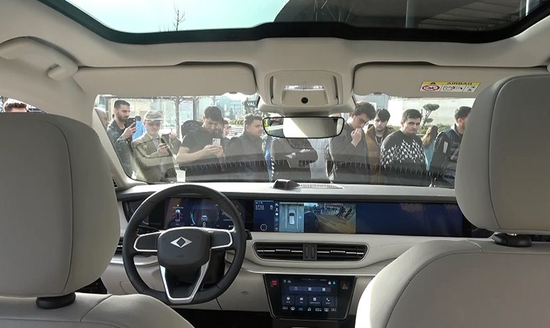 c Otomobili satın almadan önce yakından incelemek istediğini söyleyen Özcan Başoğlu, “İnternetten takip ediyorduk. “Bir an önce gelsin de görelim” istiyorduk. Burada sergileniyor. Biz de daha yakından bakmak istiyoruz. Almaya niyetimiz var. Başvuru yapmadan önce bir yakından görelim dedik” diye konuştu.