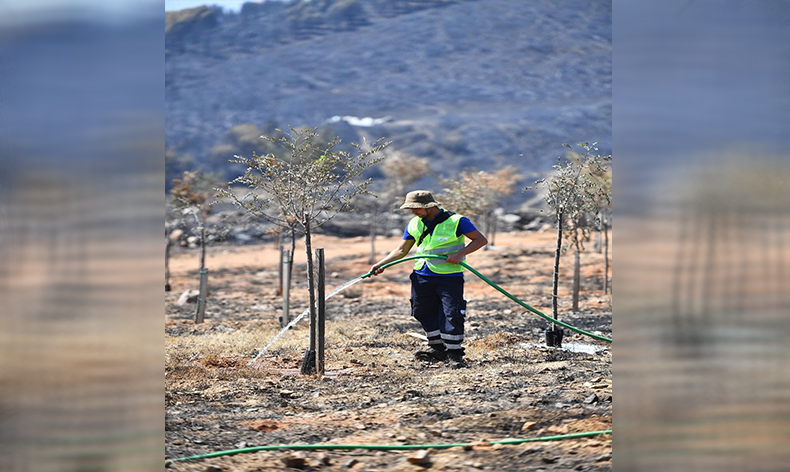 Çalışmalar hakkında bilgi veren İzmir Büyükşehir Belediyesi Park ve Bahçeler Dairesi Başkanı Müge Deniz Bal, “Bizim yangın alanlarında 3 ağaçlandırma bölgemiz var. Yaklaşık 200 bin metrekare ve 15 bine yakın ağacımız mevcut. Bunlarla ilgili çalışmayı İzmir Büyükşehir Belediye Başkanımız Dr. Cemil Tugay ile yaptığımız görüşmelerin ardından acil olarak başlatmış bulunmaktayız. Bizim alanımızda açılan bakım yolları sayesinde zararlarımız bölgeye göre en az seviyede. Bu nedenle ağaç çanaklarının oluşturulması ve güçlenmesi için bir sulama işlemi başlattık. Vejetasyon dönemlerinde de kök güçlendiriciler vererek ağaçlarımızın daha iyi bir hale gelmesi için çalışmalarımızı planlamış bulunmaktayız” şeklinde konuştu.