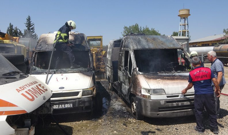 Adıyaman’da yaşı küçük çocukların içerisine binerek yaktıkları iki ambulans küle döndü.
