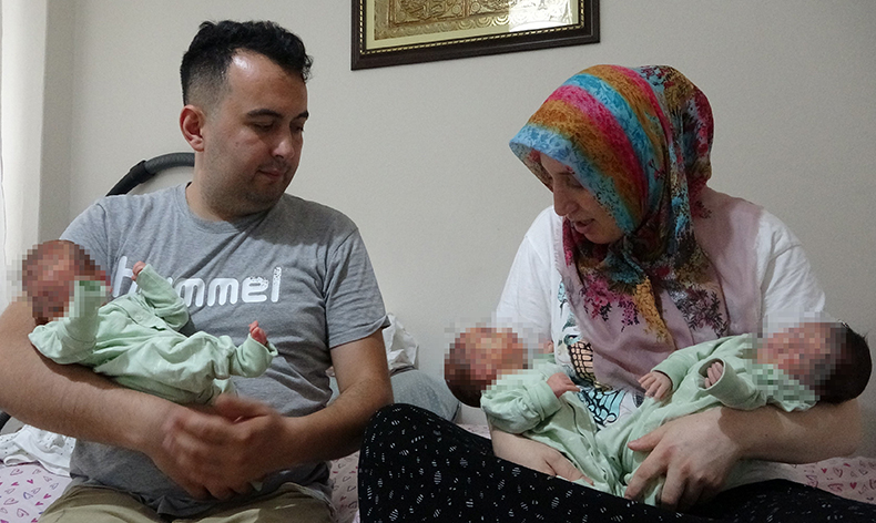 Giresun’da bir iş yerinde asgari ücretle çalışan eşi ev hanımı olan Ali Hakyemez ise, Cumhurbaşkanının, “En az 3 çocuk sahibi olun” isteğini tek seferde yerine getirdiklerini ifade ederek, “Eşimle 5 yıllık evliliğimiz sürecinde hep bir çocuğumuz olsun istiyorduk, 6. yılımızda üçüzümüz oldu. 5 yıl boyunca bir bebeğimiz olsun diye uğraştık doktorlara gittik, testler yaptırdık ama bir sorun olmadığını öğrendik. Biz de Allah’a bıraktık. Allah’ta bize böyle üçüz nasip etti çok şükür mutluyuz. Zaten Cumhurbaşkanımız 3 çocuk demişti, biz de Cumhurbaşkanımızın 3 çocuk isteğini tek seferde yerine getirdik. Cumhurbaşkanımızdan da desteklerini bekleriz. Tabi ki eşimin tek başına üçüzlere bakması kolay olmuyor ben de her konuda yardımcı oluyorum” diye konuştu.