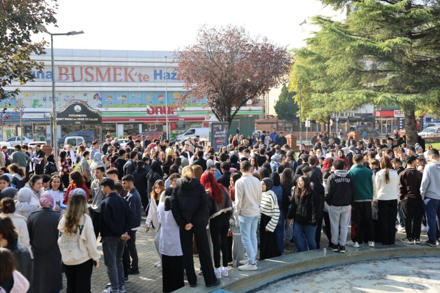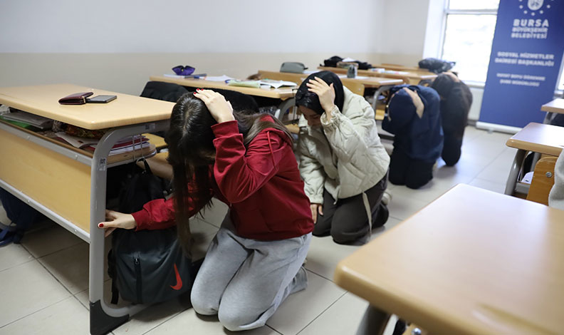 Bursa Büyükşehir Belediyesi Afet İşleri Dairesi Başkanlığı Afet Koordinasyon Şube Müdürlüğü koordinesinde Hürriyet YKS Hazırlık Merkezi’nde yapılan deprem tatbikatı gerçeği aratmadı. Alarm sesiyle birlikte ders sıralarının yanında çöp-kapan-tutun taktiğini uygulayan 600 öğrenci ve 45 öğretmen, daha sonra acil durum müdahale ekiplerinin yönlendirmesiyle binadan tahliye edildi. Bina dışında belirlenen alanda toplanan gençler, AKOM yetkilileri tarafından deprem ve tahliye tatbikatı hakkında bilgilendirildi.