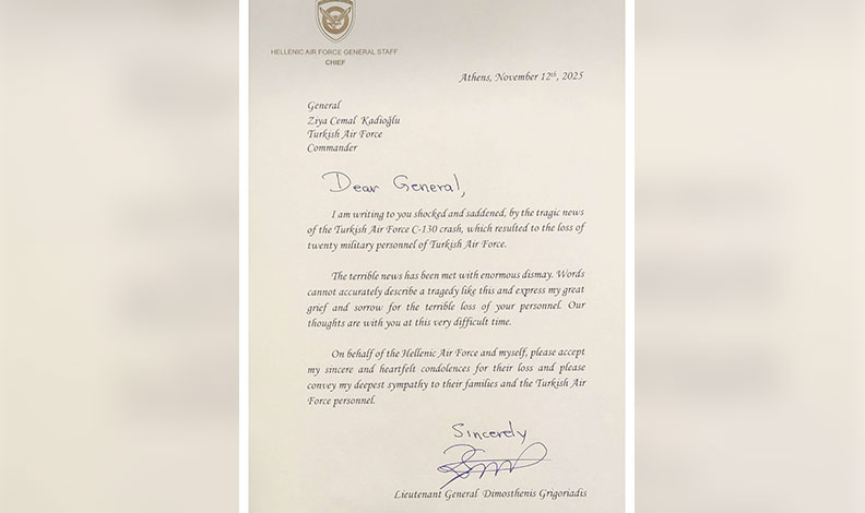 Mesajda, “Sayın General, Türk Hava Kuvvetleri’ne ait C-130 tipi uçağın düşmesi sonucu 20 Türk Hava Kuvvetleri askerinin hayatını kaybetmesiyle sonuçlanan trajik haberi duydum. Şok ve üzüntü içinde size yazıyorum. Bu korkunç haber büyük bir üzüntüyle karşılandı. Kelimeler böyle bir trajediyi tam olarak anlatamaz ve personelinizi kaybetmenin verdiği büyük acıyı ve üzüntüyü ifade edemez. Bu zor zamanda düşüncelerimiz sizinle. Yunan Hava Kuvvetleri ve şahsım adına, lütfen içten ve samimi taziyelerimi kabul edin, ailelere ve Türk Hava Kuvvetleri personeline en derin taziyelerimi iletin” ifadeleri yer aldı.